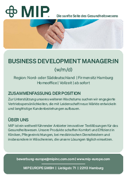 Sind Sie auf der Suche nach einer neuen Herausforderung in einem Umfeld, das sich durch Teamwork, gegenseitigen Respekt, Einsatz und dem Streben nach Zusammenarbeit, effektiver Kommunikation sowie fairer und gerechter Behandlung auszeichnet? Dann bewerben Sie sich noch heute. Sie werden MIP als einen Arbeitgeber kennen lernen, der es Ihnen ermöglich Ihr Potetial voll auszuschöpfen ohne dabei Ihre Work-Life-Balance aus den Augen zu verlieren.
